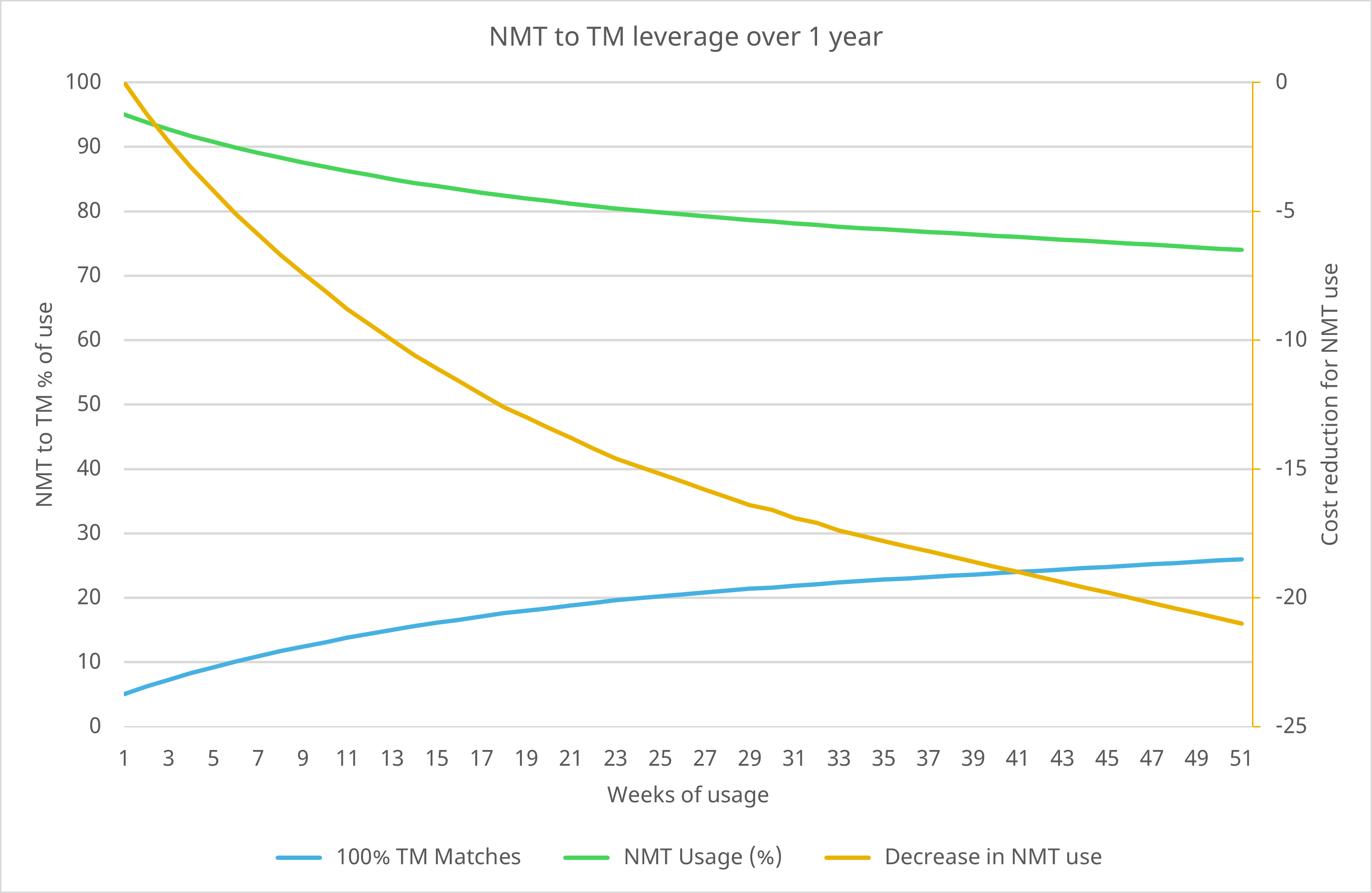 | Time | 100% TM Matches (%) | NMT Usage (%) | Decrease in NMT |
